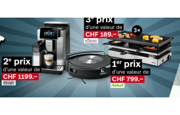 Gagnez 1 robot aspirateur et laveur iRobot de CHF 799.- / 1 machine à café De'Longhi de CHF 1'199.- et 1 Pizza/Raclette 4-en-1 Koenig de CHF 189.-