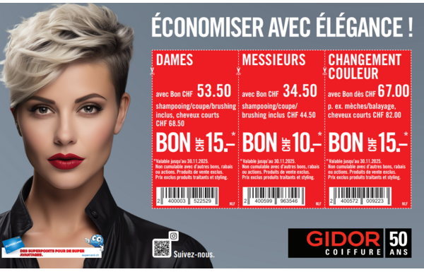 Jusqu'au 30 novembre 2025, sur présentation du bon, vous bénéficiez d’un rabais pouvant aller jusqu'à CHF 15.– sur une sélection de prestations