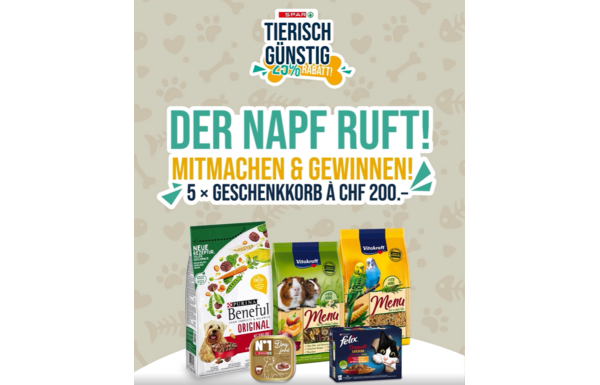 Gagnez l'un des 5 paniers cadeaux d'une valeur de CHF 200.- adapté individuellement à votre animal - peu importe qu'il soit chien, chat, oiseau ou mammifère